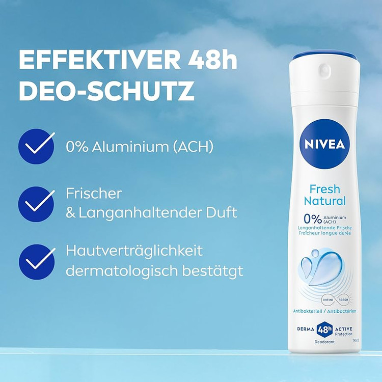 ویژگیهای اسپری دئودورانت زنانه نیوآ مدل Fresh Natural حجم ۱۵۰ میل