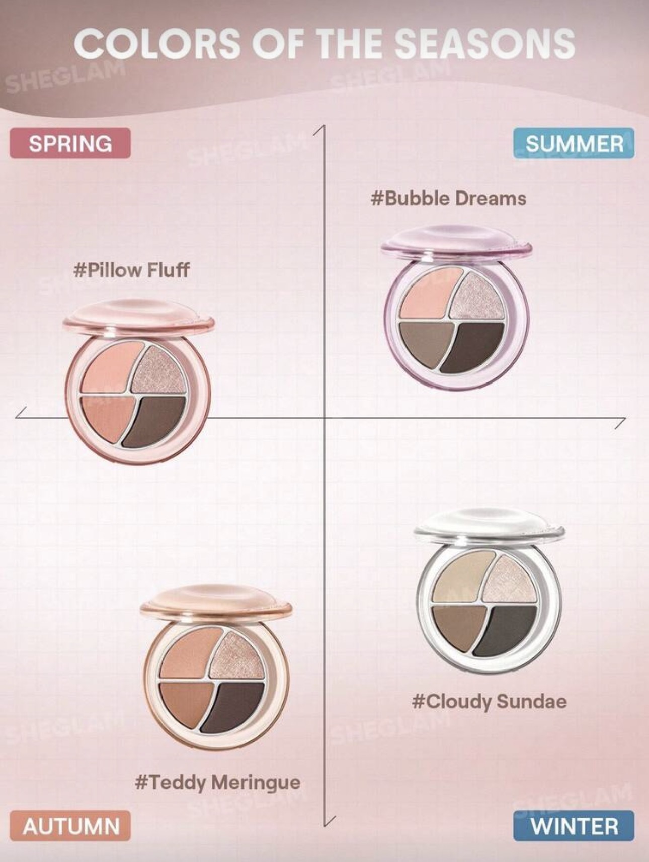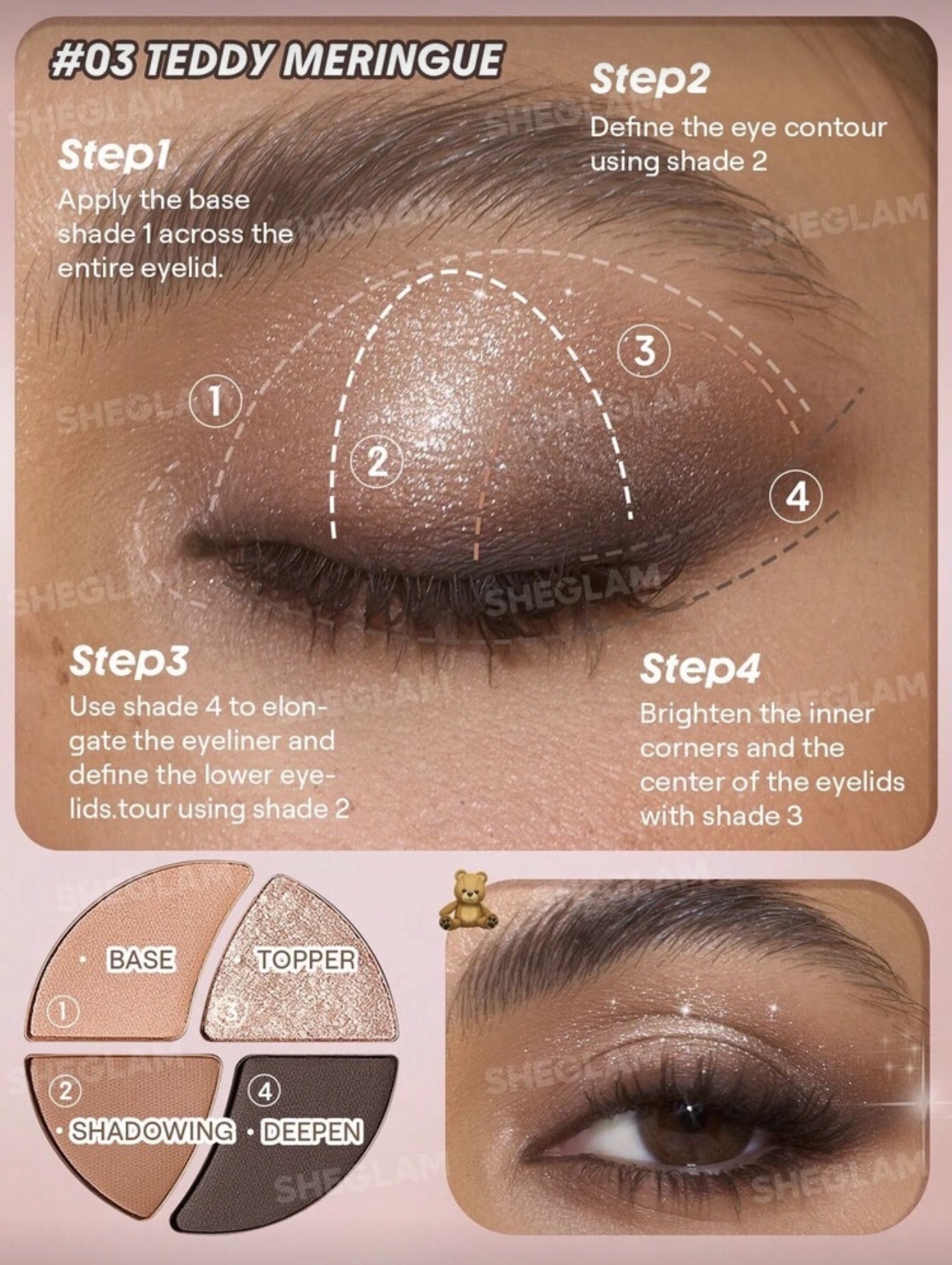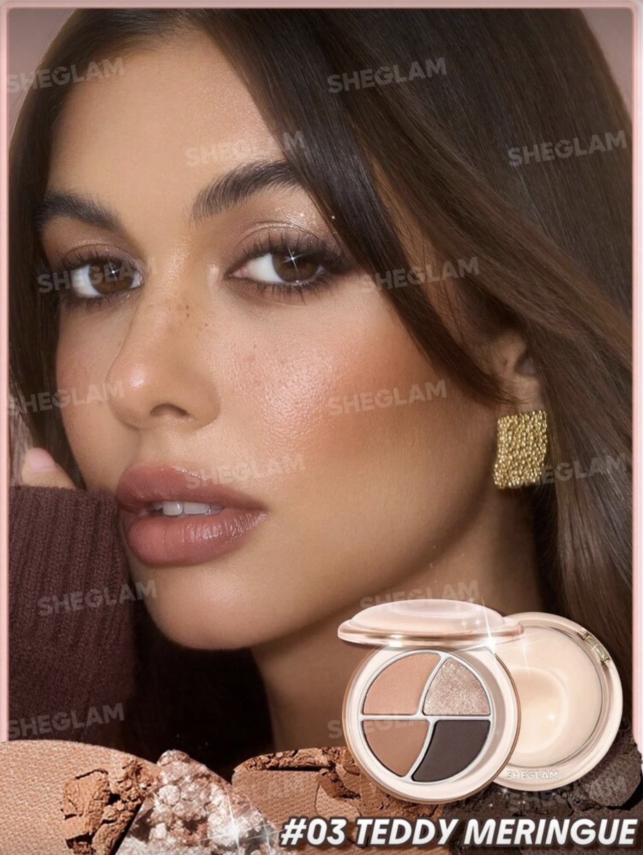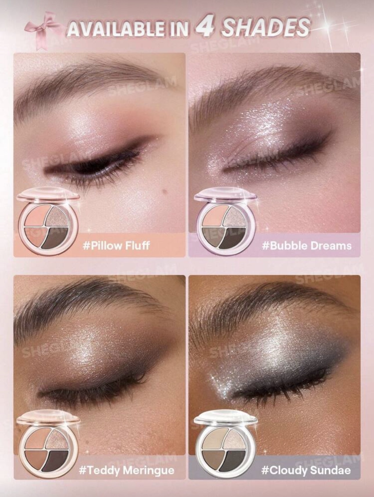 Daydreamer Mini Palette – Teddy Meringue یک پالت چشم مینی با ۴ رنگ دارد: سه رنگ مات ابریشمی و یک رنگ براق با افکت “wet-look” یا نیمهمرطوب. ترکیب این رنگها طیف ملایم تا براق را ارائه میدهد که مناسب استفاده روزمره و با قابلیت ترکیب آسان است .