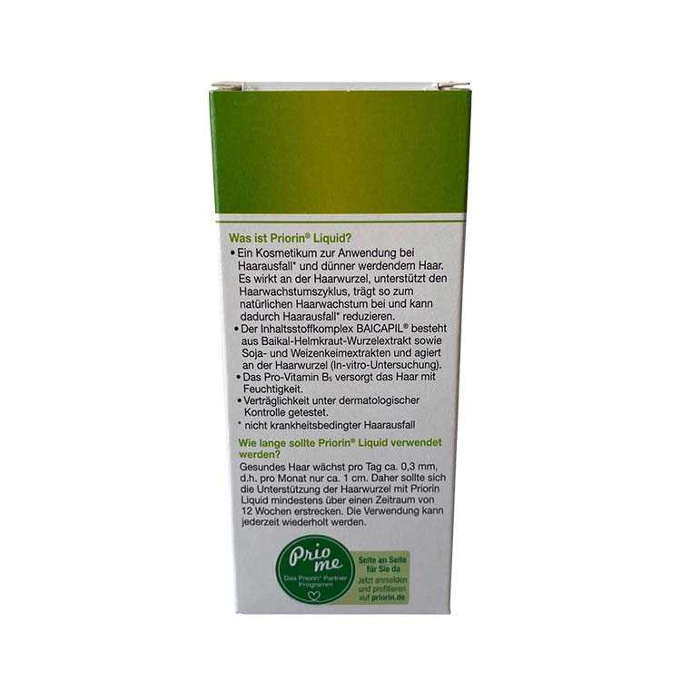 اسپری priorin liquid با عصارههای گیاهی و ویتامینهای ضروری جهت تقویت فولیکول و سلولهای مویی، باعث تحریک و رشد بیشتر سلولهای مو میشود .حجم این محصول 50 میلی لیتر است که باید روزانه یکبار به کف سر خود اسپری کنید. دوره درمان را باید حداقل تا 12 هفته ادامه دهید.