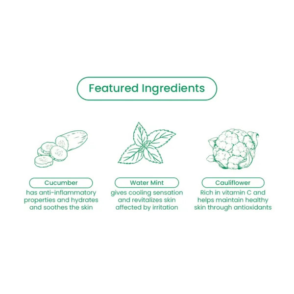 - عصاره نعناع، رزماری و خیار: احیا کننده، ترمیم کننده، خنک کننده، تسکین دهنده و محافظت کننده پوست.