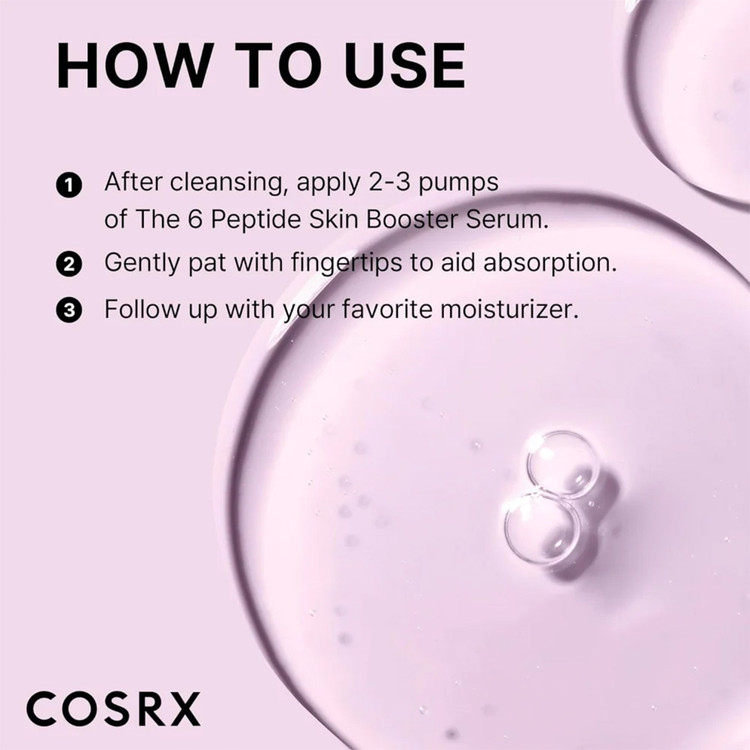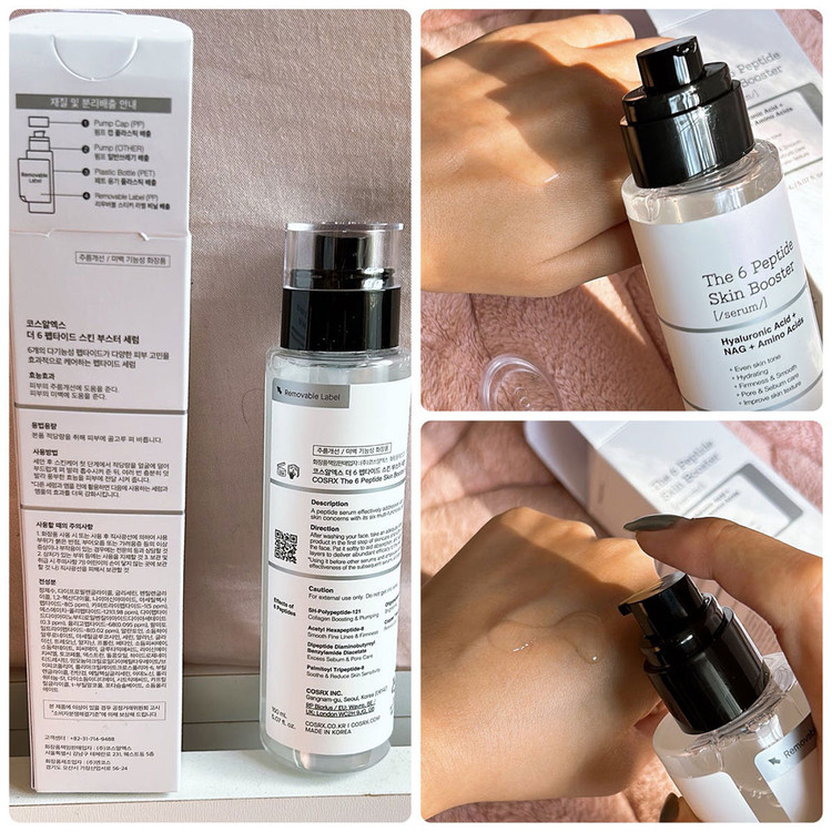 یکی از پرفروشترین محصولات برند COSRX با تأثیر فوری و قوی در کاهش چین و چروکها، آبرسانی عمیق پوست و روشن کنندگی، سرم پپتاید کوزارکس است. این سرم حاوی 6 پپتید فعال است که خاصیت تقویت کننده کلاژن، بازسازی بافت پوست، روشن کننده، آرامشبخش، سفت کننده و مراقبت از چربی اضافه پوست دارد. بوستر سرم تقویت کننده ۶ پپتاید کوزارکس ساخت کره است. ترکیبات مغذی و فعال این سرم با انواع پوست بهویژه پوست حساس سازگار است. برای خرید سرم پپتاید کوزارکس دکترشیم در خدمت شماست.