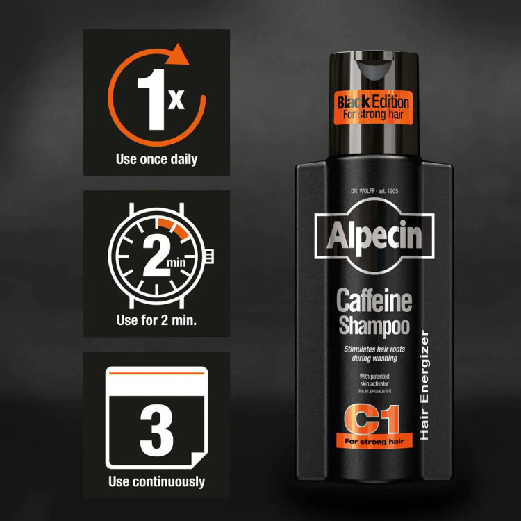 از شامپو کافئین آلپسین C1 بلک ادیشن Alpecin Caffein Shampoo Black Edition C1 می توانید به صورت روزانه استفاده کنید. پس از شست و شوی شامپو کافئین، کافئین جذب پوست سر می شود. ماده فعال از طریق ساقه مو به فولیکول های مو حرکت می کند. به دلیل جذب سریع، فقط باید حدود دو دقیقه موهای خود را با شامپو کافئین بشویید.